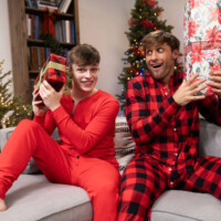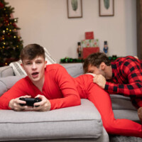 College student Jake Preston brought his boyfriend, Dom King, home for the holidays, but they have to sneak around! Jake unbuttons Dom’s long underwear while Dom plays video games on Christmas morning, and sneakily sucks him, then Dom rims him through the butt flap of his own long johns! They hide their boners under a blanket, but Jake’s mom catches him riding his BF’s dick on the couch. Dom fucks the twink doggystyle and in spoon position, then pounds that holiday hole in missionary till they both cum.