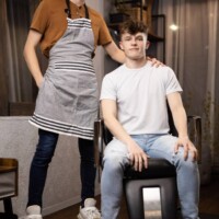 The clear plastic window in the barber’s cape is supposed to be for looking at your phone, but after Jake Preston gets horny during his haircut, it allows the sexy salon owner, Cristiano, to see Jake stroking his hard cock! Jake beckons Cristiano over, who quickly ducks under the cape to suck that cock, much to the annoyance of the barber when Jake can’t keep his head still! Cristiano 69s the client in the chair and Jake tongues his hole, then bends him over and fucks it. Jake drills the bottom in missionary, then Cristiano rides that dick till he cums, and gets down to take a facial.