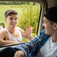 Horny twinks Jake Preston and Troye Dean are rolling down the road to the big festival in their RV when they spot a hot hitchhiker with the same destination and pull over to pick him up. Jake spots Maverick Sun flirting with him in the rearview, so he asks Troye to take over driving so he can slip in the back and have a little fun pounding Maverick’s tight butthole.