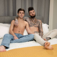 When his roommate is away, Hatler Gurius gets to treat himself to some serious gooning time. He strips down and shuts himself in his room, settling in to jack it to some porn. Joey Mills gets home early and peeks in, only to see something shocking: his roommate sliding his long cock into his own hole! Joey watches, stroking himself, as his roommate self-fucks, but Hatler sees him and pushes him up against the wall!