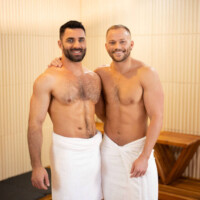Dark-haired hunk Levi is relaxing in the sauna when newbie River comes in and notices Levi’s cock is so hard, it’s pushing his towel up. The guys chat about their workouts, and River comments on that impressive boner. “Can’t help it,” Levi says with a laugh, opening his towel and issuing a wordless invitation River immediately accepts.