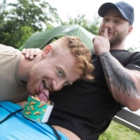 William Seed and Tim Jame = WOOF. To be an ethical and fully transparent journalist I have to admit my bias, I would love to play with both these studs. William Seed has to share a campsite with Tim James and his boyfriend after the booking company makes a mistake. William is annoyed with the couple at first but pretty soon has his sweaty nuts in Tim’s mouth.